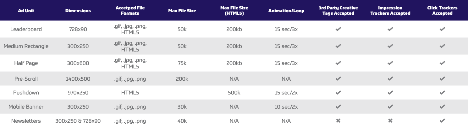 We're glad you chose us! Below is more information about available ad units, specifications, and requirements for creative. If you have any questions or need additional information beyond what is provided, please contact us.