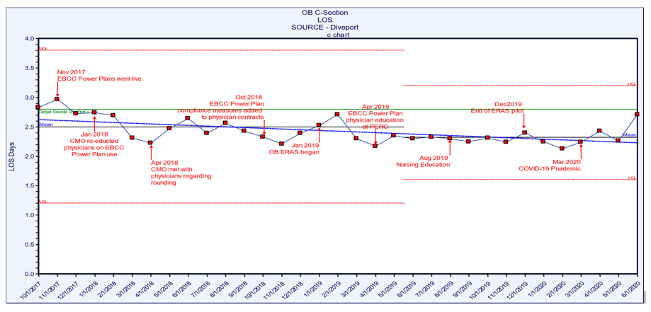 The overall LOS for the C-section population with improved bundle compliance decreased from 3.0 days in FY 2017 to 2.30 days in FY 2019 and prior to COVID-19 in Q1 2020. Perinatal Care Quality Measures also include standardization practices such as prophylactic antibiotics, VTE prevention and pain control.