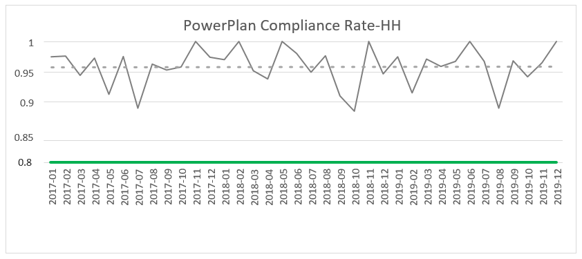 The numerator in their care bundle utilization is the clinical practice being measured for compliance (PowerPlan utilization) and the patient population is the denominator which meets the MS-DRG definition for cesarean section cases. BHSF and Homestead Hospital follow the guidelines and recommendations of ACOG, CMS, MS-DRG and benchmarks against Premier. Targeted performance LOS of 2.30 days and bundle compliance of 80% (Figure 10).