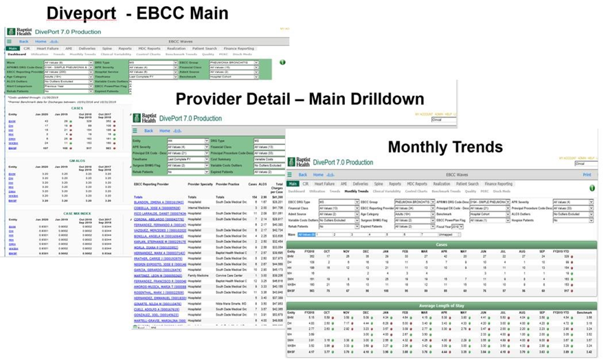 The EBCC is the governing body that drives the focus on reducing unnecessary cost and clinical variation through the implementation of evidence-based clinical standards integration, with real-time availability of clinical information and analytics. EBCC monitoring data is housed in DivePort 7.0 (Figure 12).