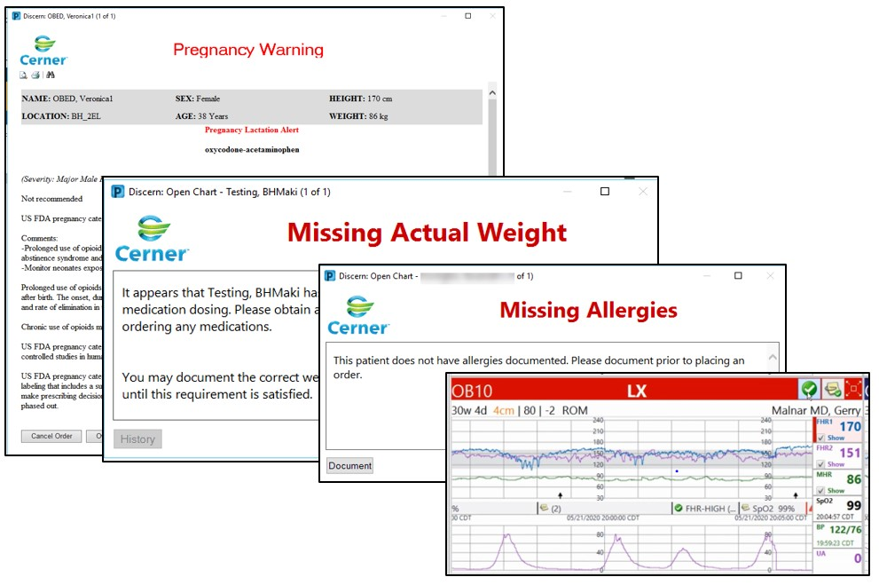 Alerts are visible on monitors, dashboards and within the EHR. CDS alerts such as sepsis with the St. John’s sepsis algorithm, allergies, contraindicated medications, weights and even fetal demise are examples of the alerts firing in real-time to keep mother and baby safe (Figure 7).