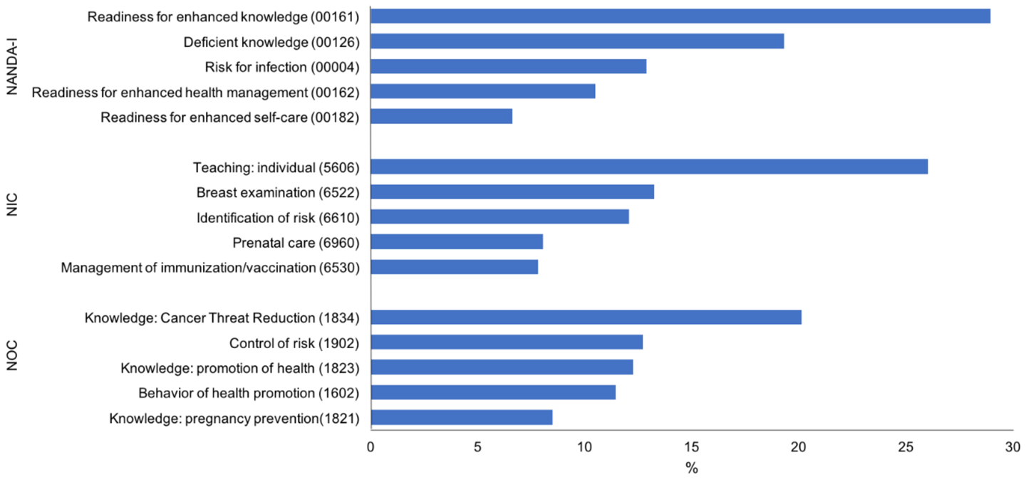 SIPCE systematically consolidates the students' care plans from the nursing program of the University Industrial of Santander in all practice sites. From 2015 until June 2018, students registered 5,236 NANDA-I, 5,160 NOC, and 5,599 NIC labels. Among the NANDA-I records, the diagnostic label "preparation for knowledge improvement" code (00161) was the most frequent, with 29%; in fifth place, with 6%, was the label "preparation for self-care improvement" (00182). In the case of the NIC taxonomy, the label "teaching: individual" (5606) was the most frequent with 25%; in fifth place was "immunization/vaccination management" (6530) with 6%. Finally, the most frequent label in the NOC taxonomy was "knowledge: cancer threat reduction" (1834) and in fifth place "knowledge: pregnancy prevention" (1821) at 9%. Students and professors use this information according to their needs. Figure 2 presents the top 5 NANDA-I, NOC and NIC labels.