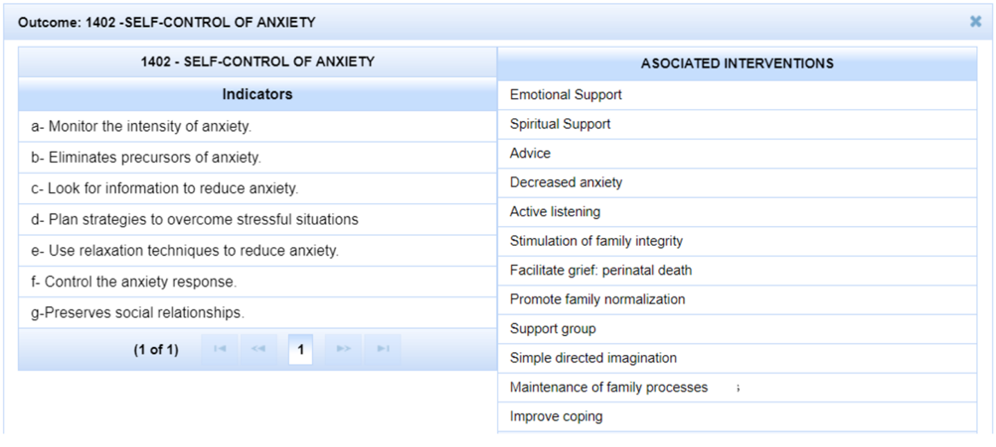 In addition, with SIPCE information, professors build case studies and didactic material such as printable NOC booklets. Students can find a list of the most frequent NOC labels, their respective indicators, and related interventions and consult them during their practices. For example, at the top of Figure 3 is the NOC label "anxiety self-management" (1402), on the left side, there is a list of indicators related to this outcome label, and on the right side of the image, there is a list of interventions suitable to be implemented according to outcome label 1402.