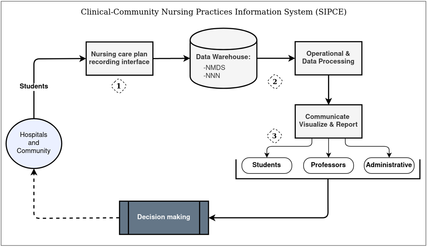 Figure 1 outlines the workflow of the latest version of SIPCE into three significant entities and their interactions from data sources to the decision-making. The first entity enables the students to digitize the patients' cases through the nursing care plans to store them into a shared database using the NMDS and NNN standards. The second entity integrates users and software for operational and data processing; professors control patient information by supervising the NNN labels selected and care plans registered by nursing students before storing them in the SIPCE system. Finally, the third entity is devoted to the communication and report process.