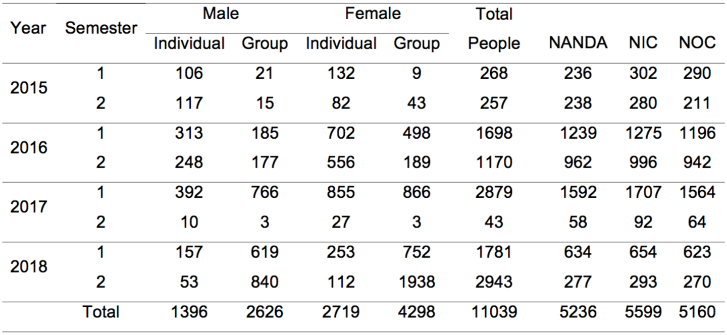Table 1. The number of people cared for by nursing program students from January 2015 to June 2018.