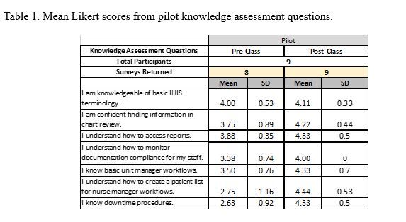 Approach: A pilot, instructor-led class was developed specifically for nine nurse leaders in January 2020. Two subsequent classes (n=23) were conducted virtually due to the pandemic with topics including manager lists, audits, downtime, reports, and unit workflows. All participants were given a survey using a five-point Likert scale to assess knowledge before and after class completion.