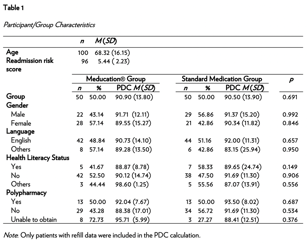 We found no statistically significant differences between these characteristics to medication adherence. For instance, males who were given Meducation® versus males who received a standard medication handout did not result in any statistically significant difference (p = 0.992; Table 1).