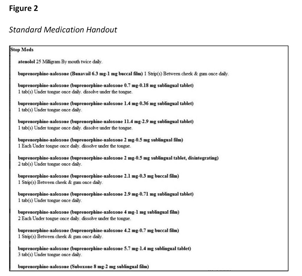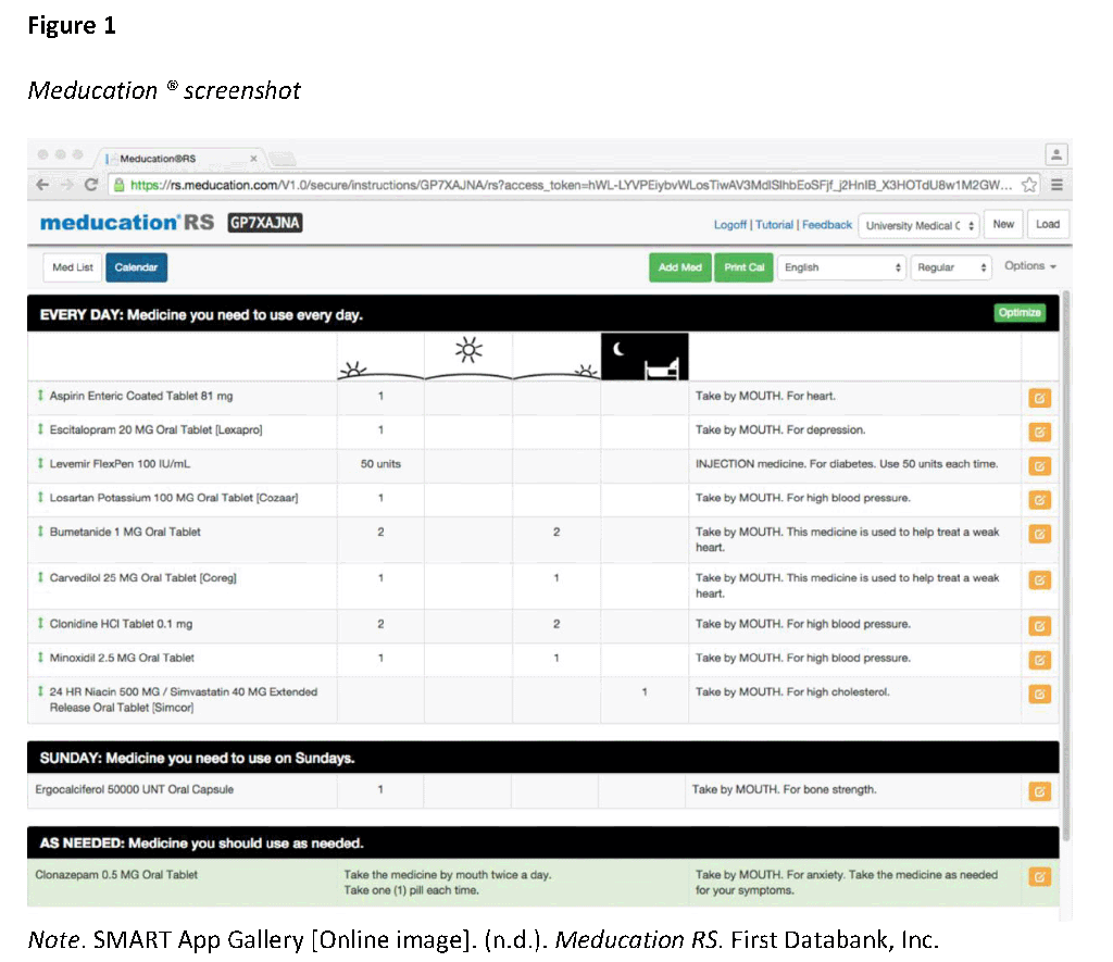 Many organizations have been exploring various techniques to improve medication adherence, including post-discharge follow-up calls, hospital-community partnership transitional programs, teach-back, motivational interviewing, financial incentives, and technology-centered medication tools such as SMART apps (Hyrkas & Wiggns, 2014; Patel et al., 2017; Starring et al., 2010). This retrospective study at one facility showed that there was no statistically significant difference between patients that received a SMART app-generated handout versus a standard medication handout to medication adherence. Meducation summarizes patients’ medication regimens into a single page that often includes pictograms of usage and a simplified calendar format (see Figure 1). The standard medication handout (see Figure 2), on the other hand, lists the medications that patients need to take with the dosing instructions after the medication. There are no grids or calendar format or pictograms included.