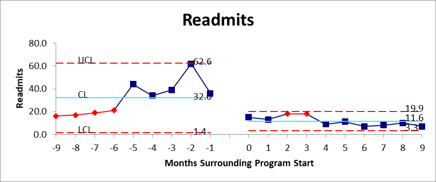 Control Chart 3: Readmissions 9 months prior to care plan implementations compared to 9 months after care plan implementation using an upper, median and lower control level. “0” represents the start of the High Utilizer Care Plan.