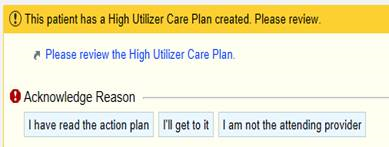 The clinical informatics nurse was essential in developing the mechanism for viewing the care plan. The High Utilizer Care Plan group requested that the care plan be easily viewable within the EHR. The informatics nurse coordinated the discussion between the High Utilizer Care Plan team and the IT build team. A detailed proposal requesting an FYI flag, inclusive of a hyperlink to the care plan, was submitted. While the proposal was vetted, it was determined, due to technical reasons, that it was not possible for the EHR to have a hyperlink within the FYI flag. The workflow was adapted to include a hyperlink to the HUCP, which was housed within a best practice advisory (BPA). This was the “easy access” the clinicians requested. Prior to the High Utilizer Care Plan BPA build being released into the live EHR environment, the workflow was demonstrated by the build team to the High Utilizer Care Plan team. Once the BPA and the workflow were vetted and accepted by the HUCP team, education was provided to the clinical teams in the emergency departments, Hospitalists and Primary Care practices. Clinicians who join the network are given the High Utilizer Care Plan education upon starting to ensure there is continued adherence to the care plan and an understanding of the team’s goals.