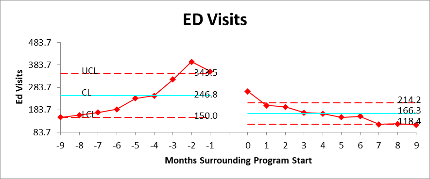 Control Chart 1: Emergency Department Visits 9 months prior to care plan implementations compared to 9 months after care plan implementation using an upper, median and lower control level. “0” represents the start of the High Utilizer Care Plan.
