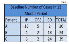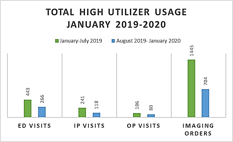 Among a small sampling of identified high utilizer patients, baseline data showed that these patients had between 20 and 29 hospital encounters within a 12-month period. The HUCP group set a goal to demonstrate a reduction of ED visits, hospital observations and admissions by 25% improvement within a 6-month or 12-month period.