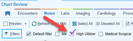 Providers and other members of the care team can also review the care plan in the notes section of chart review. The note can be found quickly by applying the “high utilizer” filter.