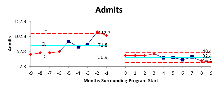 Control Chart 2: Admissions 9 months prior to care plan implementations compared to 9 months after care plan implementation using an upper, median and lower control level. “0” represents the start of the High Utilizer Care Plan.