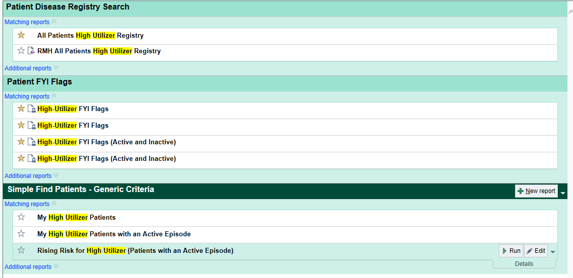 The “My High Utilizer Patient” reports are utilized by the Care Management staff to organize and prioritize patient outreaches. An Episode type of “High Utilizer” in addition to adding the care manager to the care team serve to connect the patient to the report. The report also contains reason for next outreach and rows within the report turn yellow when the patient is due for outreach indicated in the care managers’ workflow by using track patient outreach. Regular outreach care managers assist in care coordination and reduce utilization by connecting patients with resources, providing disease management and helping alleviate social barriers to self-management.