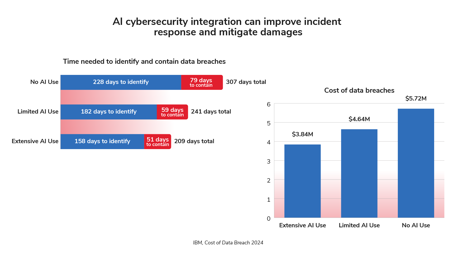 However, an important part of cybersecurity is preparing to handle any circumstance, not just successful prevention. If a breach occurs, teams equipped with AI tools and strong processes may be able to respond more effectively to help prevent harm to patients and technology assets. In an IBM report, surveyed organizations that incorporated AI tools in their cybersecurity program were able to reduce the time to identify and contain a breach by an average of 21–31%, depending on the level of AI usage. These comparisons also showed that using AI tools correlated with lower data breach costs, with an average difference of $800,000 to $1.77 million.9