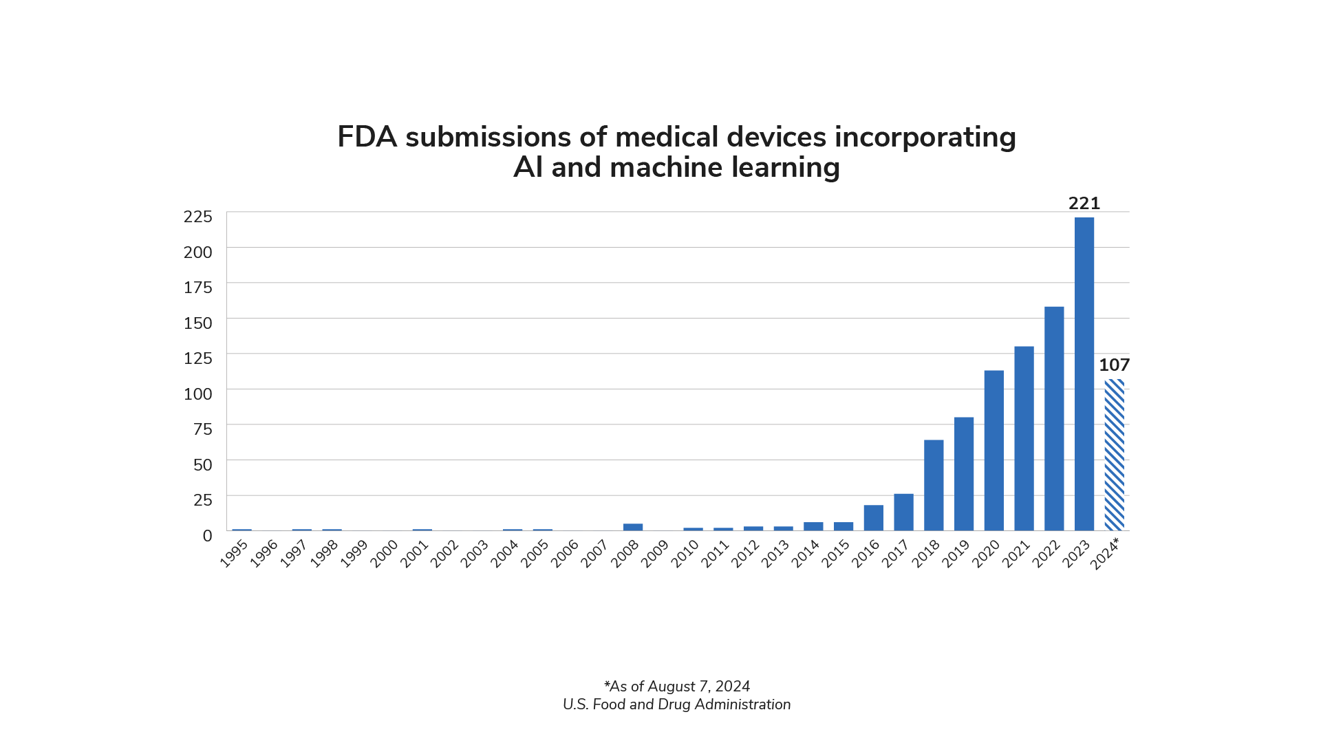 The presence of AI in health care is growing rapidly. FDA authorizations of medical devices incorporating AI technology have increased significantly in recent years. 221 devices were authorized in 2023, and 2024 is on pace to match or exceed that number.1