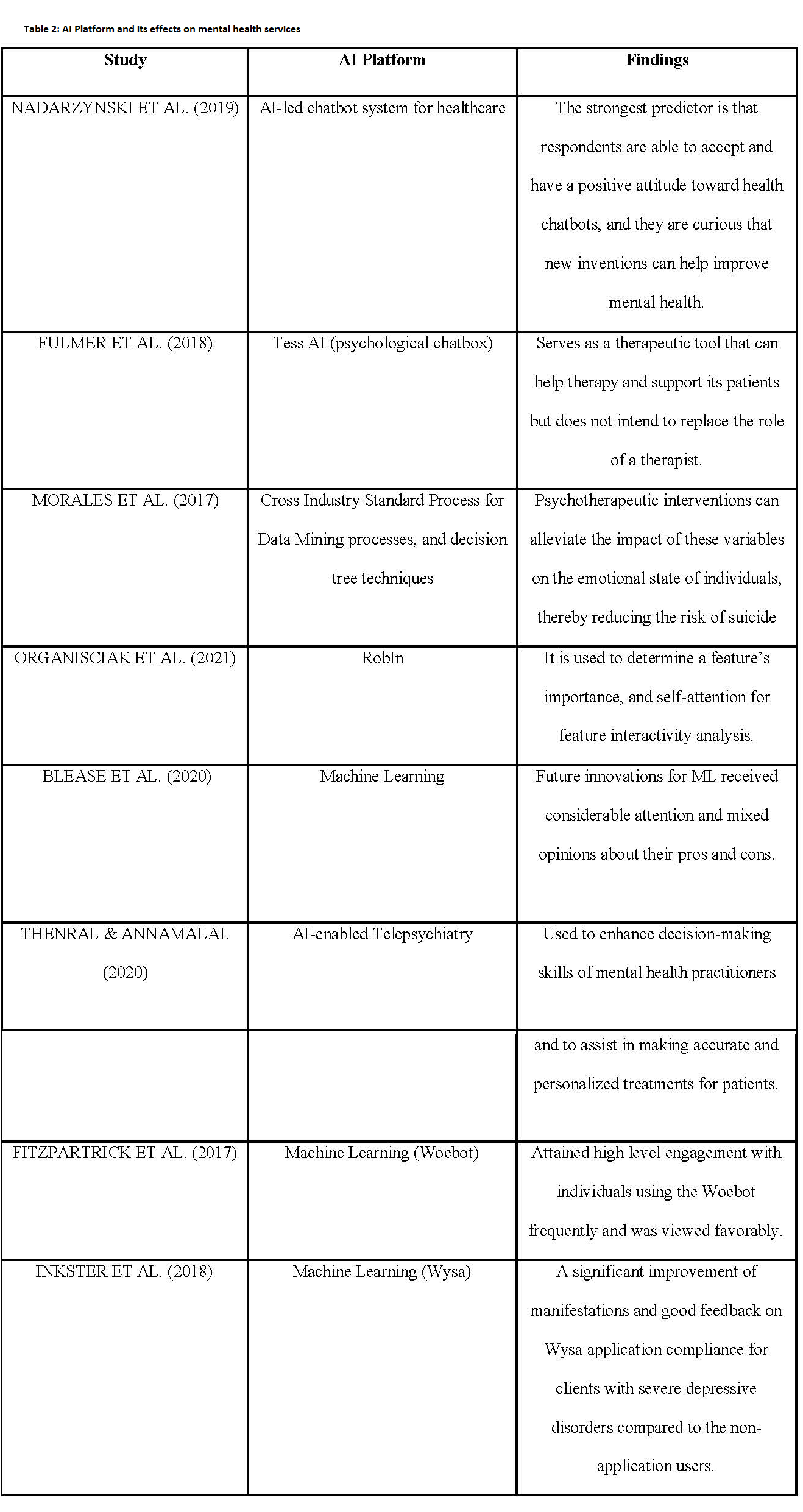 Table 2 summarizes the uses and impact of AI in mental health from the selected articles. There was continuous usage of AI platforms in mental health across the eight studies. Three studies used Machine Learning (ML), two used AI chatbots, and the rest employed other methods of AI.
