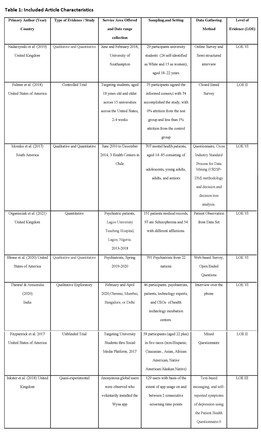 This integrative review focused on the insights from the eight studies on the role of artificial intelligence (AI) in mental health services. Technology has been an important key to support the health sector seeking to adapt quickly and safely to rising mental health needs. The burst of innovations and digital solutions using AI in all sectors of society, is being harnessed to help address the fast-paced demand due to resource inefficiency in the mental health system. One of these innovations is the development of a “thinking machine” in AI first introduced to imitate and replace human cognitive function. Nadarzynski et al. (2019) used AI-led health chatbot systems for healthcare, which makes use of huge datasets, and can be used to amplify decision-making and analytical processes while mimicking human intelligence. The health chatbots served as digital access to clinicians and reduced face-to-face consultation.