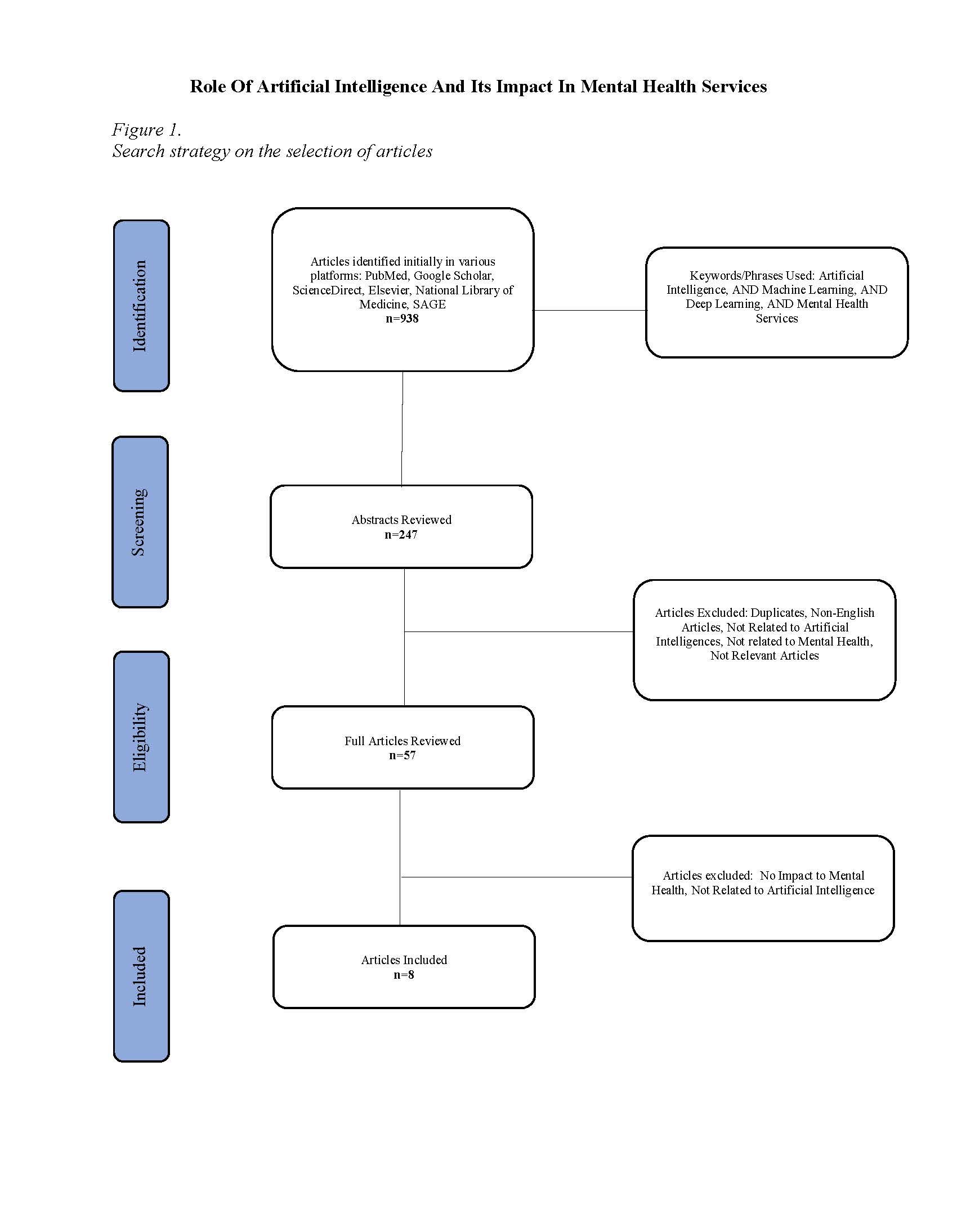 During the search strategy, the researchers made use of search databases such as PubMed, Google Scholar, ScienceDirect, Elsevier, National Library of Medicine, and SAGE. The first search of articles capitulated 1956 results, of which eight (8) met the nondiscriminatory review's inclusion and exclusion criteria. The review consisted of a series of publications covered between February 2017 up to December 2022. Upon reviewing the articles, insights, unrelated articles, and abstracts were disregarded from the publications selected and only those centered on the roles of AI and its impact in mental health services were included. Keywords/phrases used in this search were: Artificial Intelligence, AND Machine Learning, AND Deep Learning, AND Mental Health Services (See Figure 1).