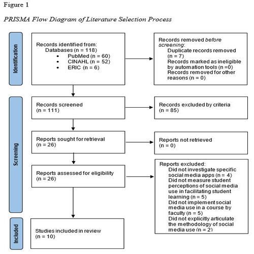 This literature review included studies focused on undergraduate nursing students and examined faculty use of social media to facilitate student learning. Exclusion criteria were as follows: articles that assessed social media utilization in graduate and professional nursing populations, systematic reviews, instrument evaluations, and commentaries. The initial search yielded 118 articles, of which 60 were identified from PubMed, 52 from CINAHL, and six from ERIC. After seven duplicates were removed, 111 titles and abstracts were screened according to the inclusion criteria. After this initial screening, 85 studies were excluded. The full-texts of the remaining 26 articles were carefully reviewed, and 16 articles were further excluded for the following reasons: studies did not investigate specific social media applications, did not measure student perceptions of social media use in facilitating student learning, did not implement social media applications in a course by faculty, or did not explicitly articulate the methodology of social media use. Thus, after the full-text review, a total of 10 articles were included in this literature review. Figure 1 shows the article selection process.