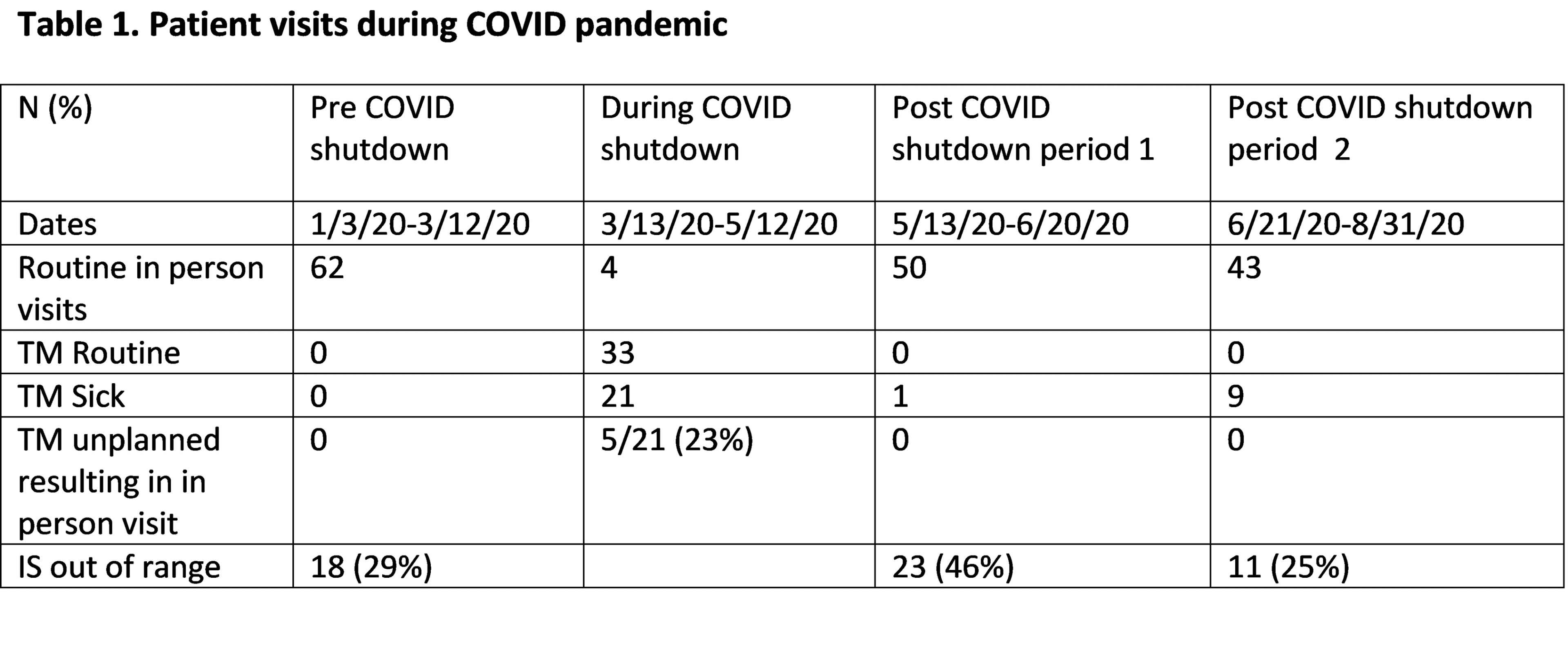 Results: During the shutdown period (March 13, 2020, to May 12, 2020) there were 54 telemedicine visits: 61% routine and 39% urgent. Five (24%) urgent telemedicine visits justified an in-person follow-up: three clinic visits, two ED visits, one patient hospitalized. During the post-shutdown period 1 (May 13, 2020, to June 20, 2020) when in person visits resumed, nine patient visits were out of window for routine follow-up, with a median of six weeks delayed. Immunosuppression levels were not therapeutic in 29% of patients in the pre-shutdown period (January 3, 2020, to March 18, 2020) compared to 46% during the post-shutdown period 1 (p=0.06). By post-shutdown period 2 (June 12, 2020, to August 31, 2020), out of range immunosuppression levels had returned to pre-shutdown out of range levels (25% of patients) with a p=0.6. The percent of immunosuppression levels out of range between post-shutdown period 1 and post-shutdown period 2 was statistically significant (p=0.04).