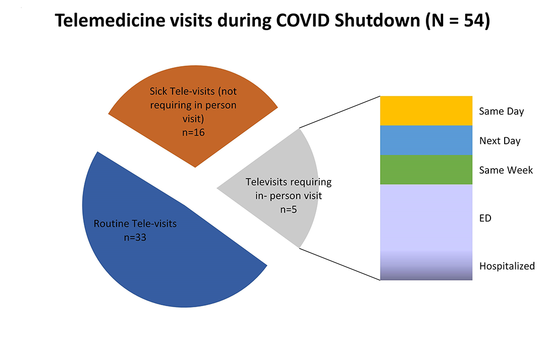 In addition, in-home phlebotomy services were restricted and non-existent for our youngest pediatric heart transplant patients in need of timed blood draw. Most pediatric heart transplant routines and urgent patient visits were transitioned to a telemedicine visit platform. Routine patients who were within one year of receiving their transplant were seen in clinic and had routine blood work monthly. Urgent patient visits were requested by caregivers and identified when a transplant patient had an acute illness or concerning medical symptom. These urgent visits were first triaged via telemedicine visits to determine if an in-person visit was warranted. Medicaid and Medicare expanded reimbursement for telemedicine visits and emergency provisions allowed for rapid adoption of both Health Insurance Portability and Accountability Act (HIPPA) compliant and non-compliant telemedicine platforms (Gadzinski, 2020). The efficacy of telemedicine as a tool to care for children after heart transplant had not been reported.