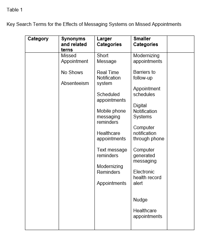 A comprehensive literature review was performed to identify the applicable research studies that have demonstrated the effects of notification systems on missed appointment rates. The literature on the effects of notification systems on missed appointments is limited. The search terms were expanded to include a broader terminology in addition to the smaller more specific terms (see Table 1, for search terms used in the literature review).