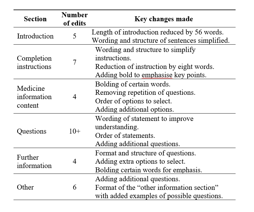 Table 4 provides a summary of the main sections of the MINI-Q and the key changes that were made as a result of the interviews and consumer feedback gathered during the "think-aloud" process. As seen from Table 4, the co-design process with consumers was a critical part of questionnaire development as over 30 edits were made across all questionnaire domains, ranging from the introduction to the wording of the items and the format of the questionnaire.