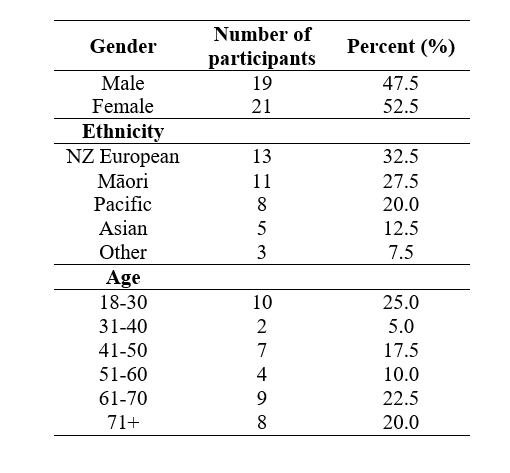 In total, 46 consumers agreed to participate in this study. However, two withdrew due to fatigue, two were unable to fully participate, and two were discharged or transferred from the ward before the interview, leaving a total of 40 who participated. One interview was only partially completed due to the consumer not feeling well enough to continue, and these data were included. The interviewees had an average of three long-term conditions, with one having seven long-term conditions. The average number of prescribed medications taken by each were six, with the maximum being 12. Of these 40, a third were NZ European, just over half were female, and their ages ranged between 19 and 92 years old (Table 2).