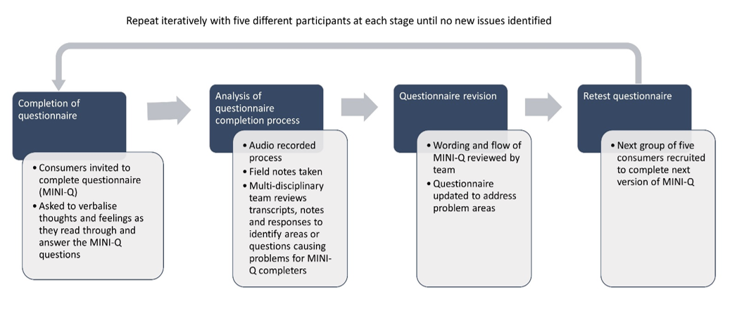 Interviews incorporating a staged iterative "think-aloud" process proved a useful technique for testing the usability and acceptability of a consumer-facing data collection tool and making tool iterative refinements in a time-efficient manner. The interviews resulted in many subtle refinements being made to the MINI-Q via a series of tool iterations. Many of the suggestions made either had not been considered by the research team or differing opinions existed within the team. Rather than the research team reaching a consensus on what wording or format was clearer, consumers themselves indicated the improvements needed. This led to a succession of improvements in the understandability of the MINI-Q that were led from a consumer perspective. These changes eventually resulted in a version of the MINI-Q that was deemed sufficiently understandable to be transformed into a digital version. The next sample of participants then completed the digital version of MINI-Q during the "think-aloud" interviews using a tablet supplied by the research team. We believe that this was a more inclusive, responsive and time-efficient way of receiving feedback than the traditional methods used during questionnaire design and development whereby often the first step is piloting one version of the tool with a small group of the target population (Polit & Beck, 2017).