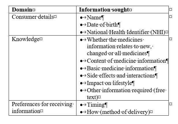 The first version of the MINI-Q was a 20-item tool designed to be completed by the consumer initially on paper, with a digital version developed once the content of the tool was finalized. The long-term goal is that the information gathered will be incorporated into consumersâ health records and be available to nurses, pharmacists and other health professionals to guide their medicine information provision, so it is individualised to the consumerâs needs, preferences and immediate priorities. The decision to have a digital version was informed by the long-term aim of being able to integrate the findings with the electronic healthcare record. The MINI-Q comprises three main domains (Table 1): information about the consumer, information requested, and preference for how and when to receive the information. The MINI-Q is designed to be completed by the consumer, and responses represent their needs at that point in time. This paper reports on the use of consumer co-design to test and further develop the MINI-Q tool by informing question and questionnaire refinement and future implementation of the questionnaire in practice and research.