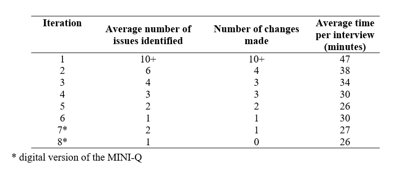 This process was undertaken in eight iterative stages with five participants at each stage (total of 40 participants; 30 participants for the paper version and 10 participants for the digital tablet version). After each stage the research team convened and decided on the changes to be made to the tool before the "think-aloud" task was repeated with the new version of the tool using another sample of five consumers. After six iterations using a paper-based version, the MINI-Q was transferred to a digital format. The iterations continued until few new comments or suggestions were received.